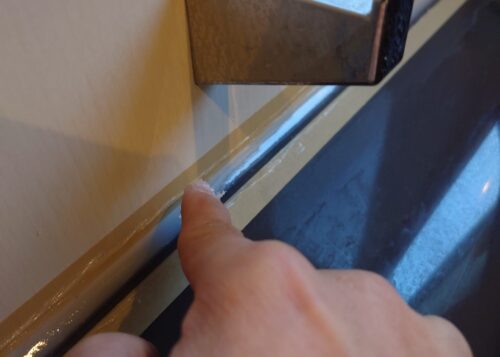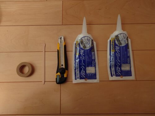 シリコンコーキングするときはコーキングガンに装着させて使用するものが一般的に使われていますが今回使ったのは握って絞り出すタイプのコーキング材を買って施工しました。